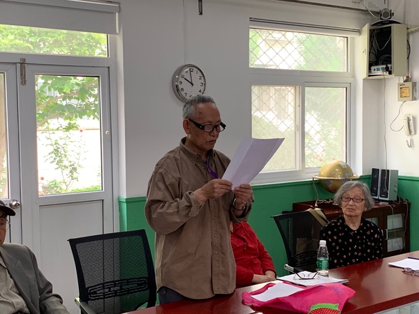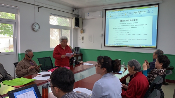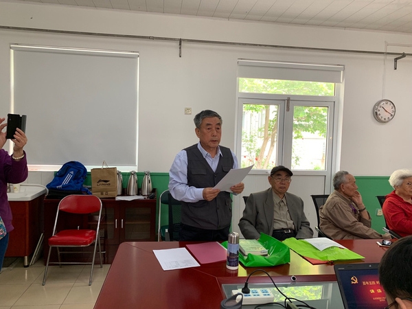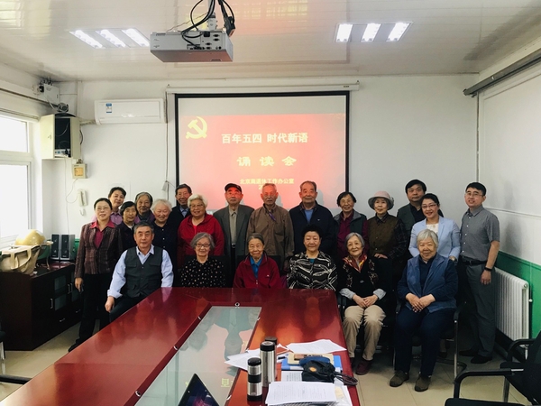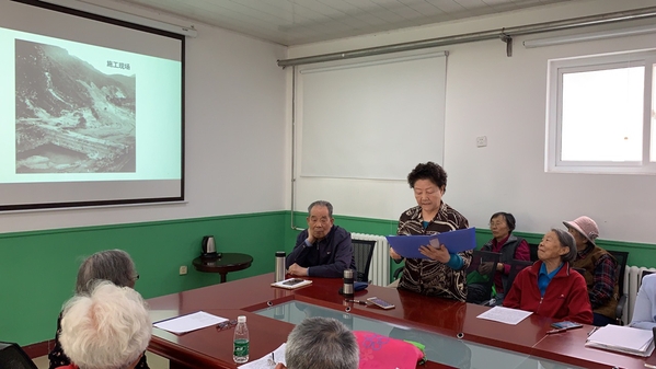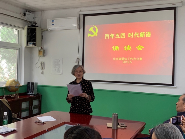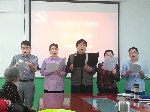 活动中有6位老师参加朗读,林柏华老师整理了详实的历史资料并撰写一首七律诗,但因为身体原因不能到场,由郭善芝老师代为朗读。韩志勇老师慷慨激昂地诵读《一九一九年五月四日天安门大会宣言》,仿佛把大家带入一百年前的大会现场,似乎听到了那一代年轻人振聋发聩的呐喊声。韩老师结合自己的经历谈到:爱国主义是最大的大道理,爱国主义可以激发出一个人的最大热情和潜能,民主科学精神需要传承。郑学新老师诵读自己撰写的《百年五四 时代新语》,通过回顾历史、展望今朝,阐明了青年是整个社会力量中最积极、最有生气的力量,新时代中国青年要增强学习紧迫感,努力掌握科学文化知识和专业技能,以真才实学服务人民,以创新创造贡献国家!迟元苓老师根据老伴儿陈玉田老师在响潭水库的一段工作经历以及近年来的两次回访,撰写完成《青春回想 清流永驻》。迟老师笔触细腻,现场深情朗诵,配上响潭水库的老照片和新风貌,吸引大家津津有味地边听边看边回想起自己年轻时的激情岁月。李玉琛老师在他的朗诵文章《五四精神需要代代传承》中,具体、深入地谈到:从年轻时接受革命教育到思想变化的成长经历,以及退休后如何继续做好传承工作,非常具有现实意义和指导意义。李老师表示:青年人面临很多选择,要将自我发展与国家需要相结合,要回馈社会,回报国家;今天对五四运动最好的纪念,就是让五四精神在新时代传承发展,放射新的光芒。杨淑昌老师撰写的散文《壮美的印记》,既优美深情又坚定豪迈,从另一个角度用大气磅礴之势描绘大美中国日新月日的发展变化。最后,办事处工作人员集体诵读《少年中国说》,致敬那段激情燃烧的岁月!
