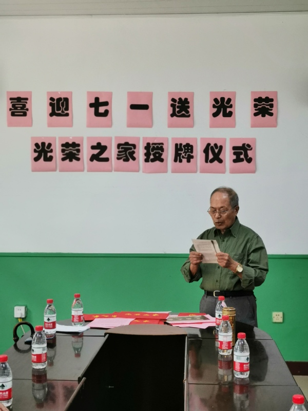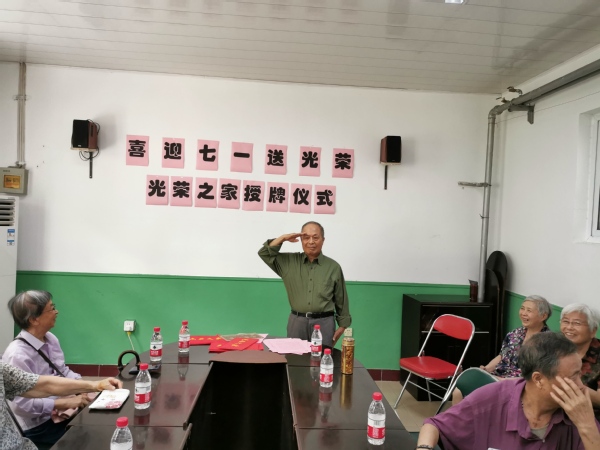 退伍军人吴同明老师讲述了自己的入伍经历,他表示,今天党和国家为他们挂上光荣牌,做为一名老兵心情无比激动,这一光荣的举动唤醒了他的军魂,立刻感觉到自己还是一名中国人民解放军战士,一名年过古稀的老兵。他以及在座的各位老兵深深感到,我们的国家在中国共产党的领导下,发生了翻天覆地的变化,但是民族的复兴仍然有很长的路要走,还要继续奋斗。做为老兵,要不忘初心,牢记军魂!最后,吴老师行了一个标准的军礼,表达他的激动之情,展示了军人风采。