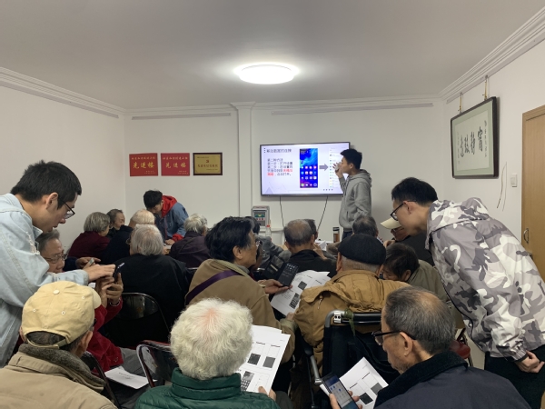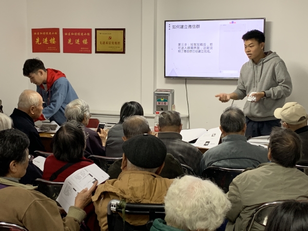 11月2日北京科技大学志愿者来了5人,由钟弘同学讲了苐一讲:联网与微信(上),在联网中讲了移动数据的连接、无线网络的连结和热点分析与连接。在微信中讲了如何下载微信、如何潻加好友和如何建立微信群。参加培训的老人有26人,在讲课后根据手机类型分为五组,由五位志愿者对他们进行面对面辅导。会上发了学习资料,老人们兴趣很高,表示要利用这次机会将智能手机学会使用,跟上时代的步伐。此类讲座后续还会有四次。