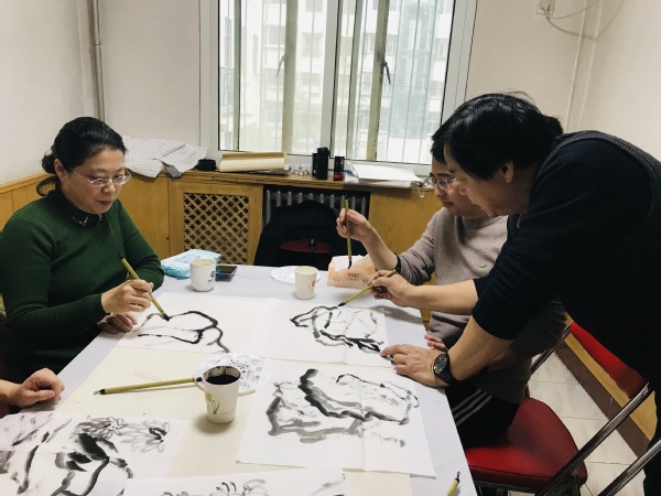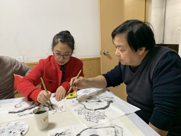 大家学画的第一幅作品就是非常应景的《菊花》。老师在指导的过程中强调了画《菊花》需要注意的几个方面:花朵要放在作品的醒目之处,花瓣的勾勒左右不要对称,可一边多一边少,有松有紧。为体现作品的丰富,可辅之以苇草、菖蒲、水草和苔点之类,以营造点、线、面的变化,但要注意疏密、浓淡、干湿、长短的变化和统一。