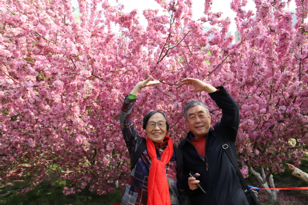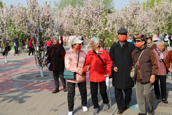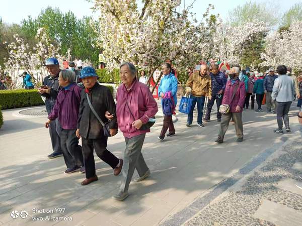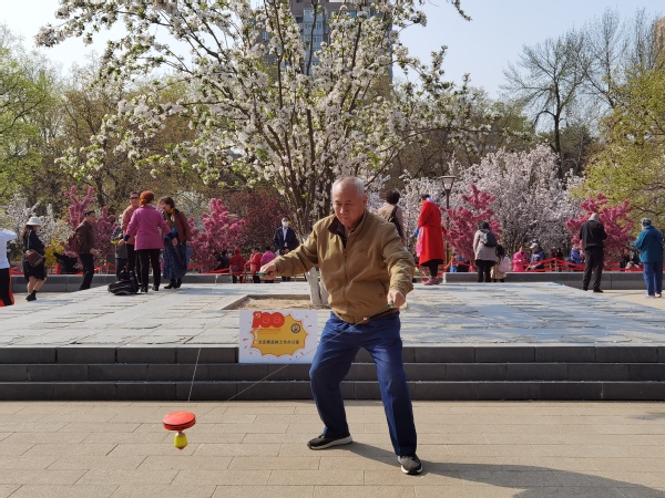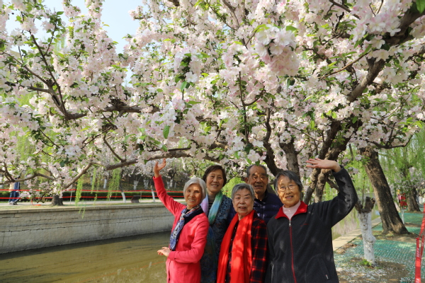 元大都城垣遗址公园全长十余公里,集历史遗迹保护、改善生态环境、休闲游览于一体,园内种植的千余株海棠,形成了京城之中面积最大的海棠林。海棠花正值盛花期,微风吹来,落英缤纷。花前树下,郁延之老师技艺娴熟地抖起空竹。漫步海棠花溪,老师们亲切交谈,欢声笑语,共叙友情。