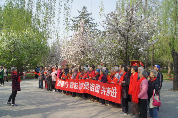 元大都城垣遗址公园海棠花竞相开放,花潮如海,蜂飞蝶舞,在美丽宜人的景色中,离退休老同志情绪饱满,舞动红旗,满含深情地唱响歌曲《没有共产党就没有新中国》、《我和我的祖国》、《歌唱祖国》。百年风雨兼程,百年砥砺奋进,老师们透过歌声唤起红色记忆,重温燃情岁月,唱出历史内涵,深切表达了对伟大的中国共产党、对祖国的深情厚意。歌声飘扬,豪情激荡,老师们用心、用情地歌唱,吸引周围观众纷纷驻足,鼓掌鼓劲儿。