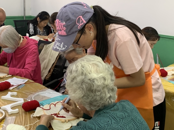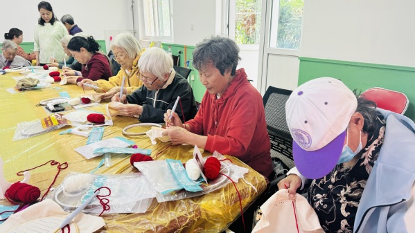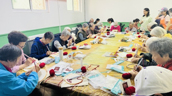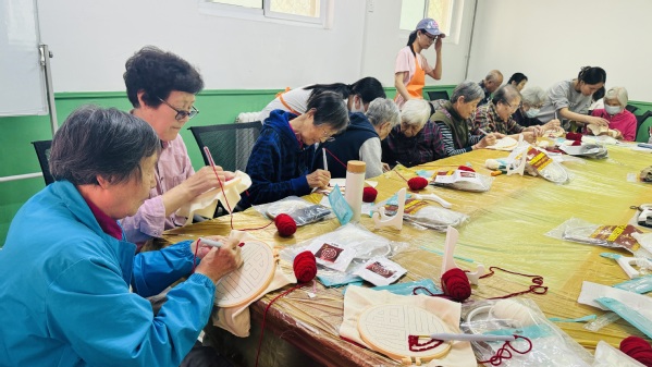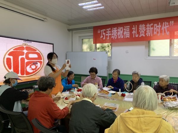 本次活动的内容是绣“福”字,现场气氛热情高涨,老同志们边学边做,从技法小白到逐渐熟练掌握技术要领,进步非常快。大家埋头默默地专心编织,忘记了时间的飞逝,忽略了身体的僵硬,沉浸在创作的快乐中,感受着非遗文化的魅力和乐趣。看似简单、重复的动作,实则蕴含着深厚的艺术底蕴。一针一线,一收一放间,作品逐渐成型。一笔一划,一戳一回间,图案缤纷绽放。老同志们用针尖的力量,编织精彩佳作,传承文化精髓;用指尖的舞蹈,诠释美好生活,礼赞伟大祖国。