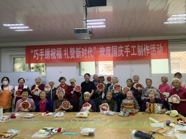 戳针遇上灵巧的双手,一幅幅生动的图案在手里逐渐显现。老同志们以绣寄情,表达了对祖国母亲75周年华诞的祝福。活动结束时,每位老师捧着手中的“福”,深情颂出:我爱你,中国!