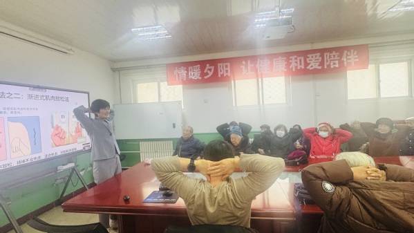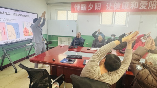 老年人常见的精神心理问题,可以通过正向表达、自我暗示、解释法、宣泄法、暗示法、升华法、代偿法、运动法等综合方式解决。老同志们对正念运动很有兴趣,希望借正念练习增强活力,让生活变得充盈。凌老师现场教授深呼吸、渐进性肌肉放松法和身体扫描放松法,老师们静静地坐在椅子上,享受身体腹式呼吸、扫描放松的过程,这些在生活中非常便于实操练习,放松解压。