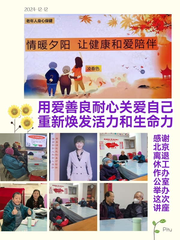 凌春色老师讲课语言生动,契合当代老年人的心理特点,借用2024年热点老人的典型事例,引经据典,事事说到老同志的心坎儿上。大家不仅了解了身心健康、情绪健康等知识,而且学习了如何调整情绪的实践方法。“宝藏老人们”在讲座中静静地享受了一次“心理按摩”,深切认识到,要及时调整个人心态,时刻保持积极乐观的精神面貌,管好自己的事,少管他人的事,不管老天的事。要用爱、善良、耐心关爱自我,重新焕发活力和生命力。大家纷纷表示,要树立正确的健康理念,保持乐观平和的心态,养成科学的生活习惯,提高生活质量和幸福感。要铸就“希望、自信、乐观、坚韧”的强大心理,快乐生活、颐养天年,为国家和社会发展继续贡献银龄力量。