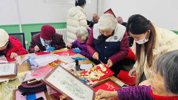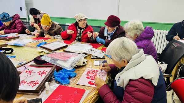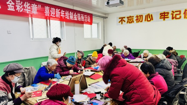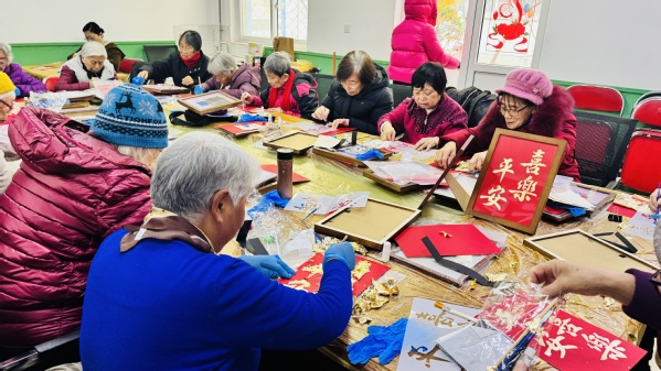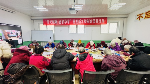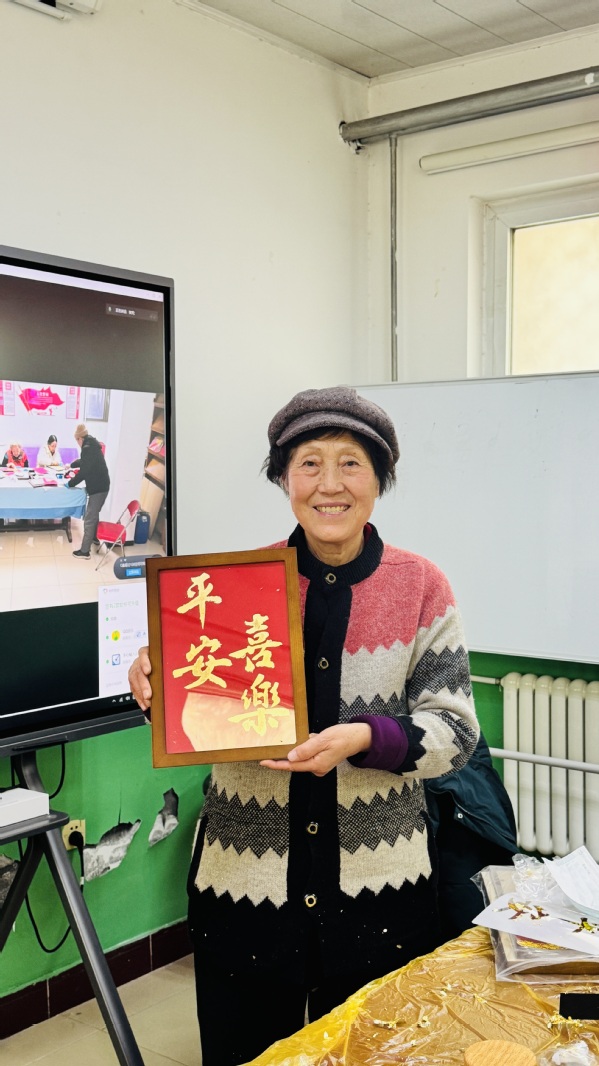 金箔画是一种传承千年的古老工艺艺术,历史悠久,文化底蕴深厚。一副完整的金箔画要完成绘图、上胶、贴箔、扫箔、封层、装裱等步骤,整个过程不仅锻炼了动手能力和创造力,还切身感受到了金箔画的独特魅力。在老师指导下,老同志们认真地动起来。一描一画,勾勒轮廓,一粘一扫,铺满填色,大家小心翼翼地绘制图案,用胶水将金箔纸粘贴在画纸上,再用手指轻轻按压,使金箔纸与画纸紧密贴合,毛刷清扫环节非常有趣味,画面上的金箔逐渐变得光彩夺目、熠熠生辉,一份份柿柿如意、喜乐平安的美好祝福跃然而出,瞬间收获了满满的成就感和幸福感。一幅幅精美的作品陆续完成,大家兴奋地展示着自己的作品,互相欣赏、交流心得。这份亲手制作的新年礼物,是对传统文化传承与创新的生动实践。亚运村的老同志通过腾讯会议一起参加活动,大家认真、投入的状态可敬可嘉。