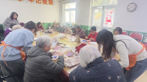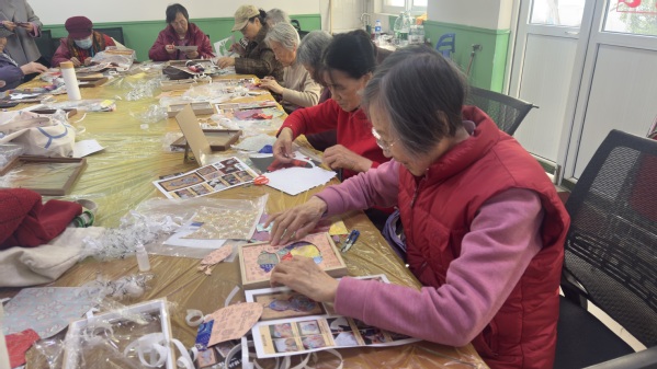 活动现场锦帛铺陈,彩线纷飞,指导老师首先详细介绍了织锦画的制作流程和技巧。本次创作有以“福禄”为主题的福袋,有象征马年奋进的骏马元素,制作环节要依次完成选材配色、剪裁布料、粘贴塑型、装裱装饰等步骤。老同志们神情专注,手法娴熟,精心挑选不同纹理、花色的织锦面料,指尖翻飞间,零散锦料拼接搭配成一幅幅独具匠心的作品。现场交流积极热烈,大家在实践中沉浸式感受非遗魅力,体会传统工艺之美,享受创作的乐趣。年满90岁的王桂芬老师与老同事们围坐在一起,她笑着说:“我们这些人啊,头发是银丝,手里绣的却是春天的颜色。大家在一起说说笑笑,感觉年轻了好几岁!”